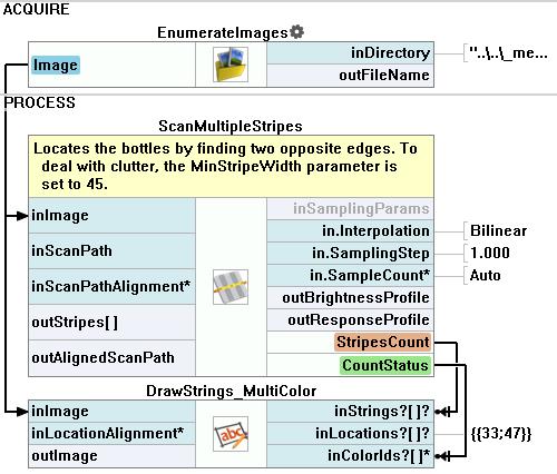 Add DrawStrings_MultiColor filter to draw the number of bottles. Set inLocations parameter to any suitable location within the input image. Connect outStripes.Count to inStrings and outStripes.Count.Status to inColorIds.