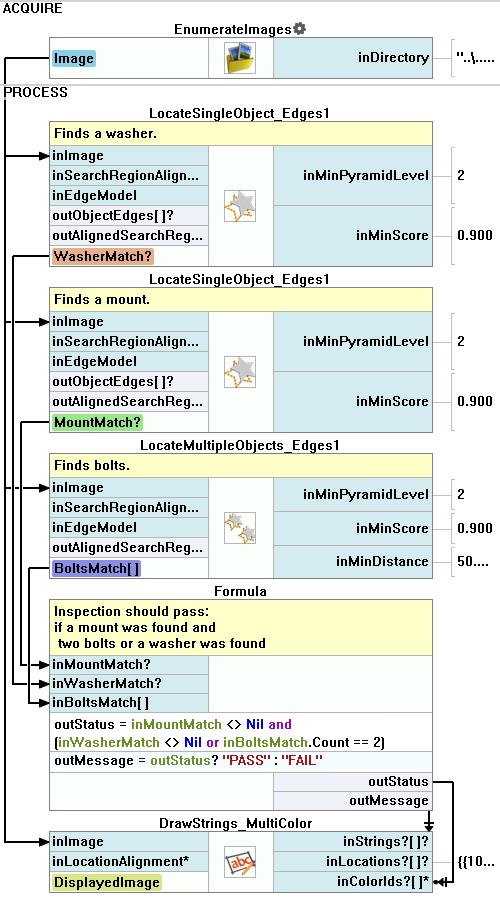 In all these filters set inMinScore to 0.9. Also set inMinPyramidLevel to 2. In the filter responsible for finding bolts, set inMinDistance to 50.