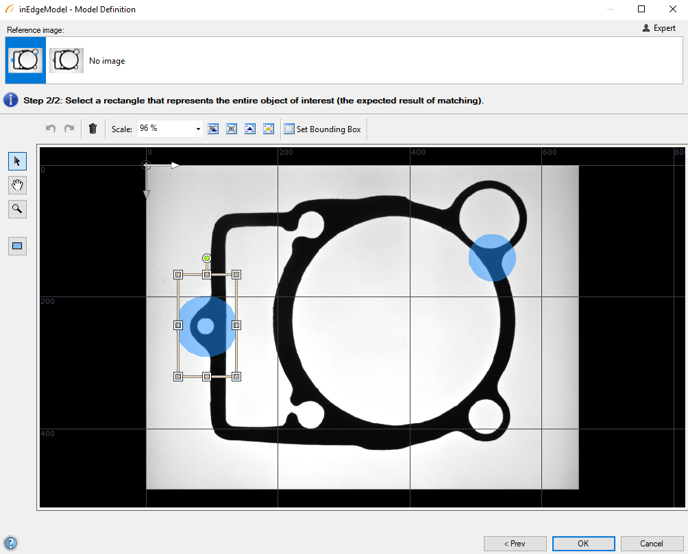 Open a template matching editor on inEdgeModel and make sure to select Expert complexity mode in the top right corner. Select the template region as shown in the picture below. Please note that you can select multiple smaller, separate regions for better rotation detection.