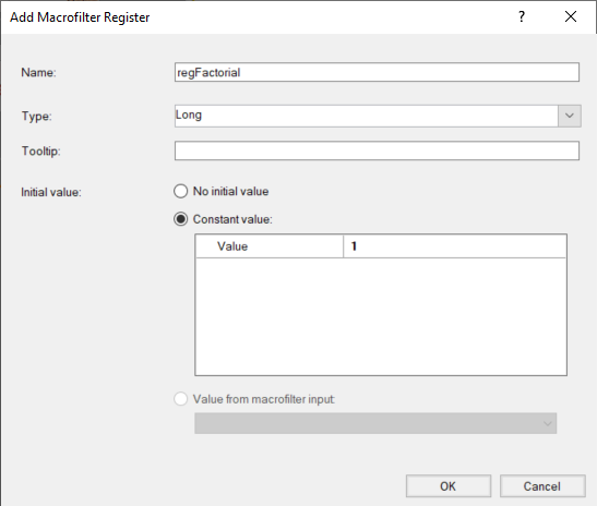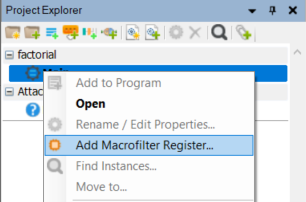 Add a new register regFactorial of type Long. To do so right-click on the Main macrofilter in the Project Explorer and select Add Macrofilter Register option: