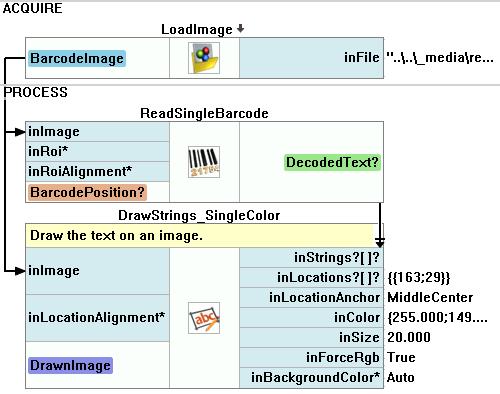 - To draw the recognized value in the image use DrawStrings_SingleColor filter. Set the text position at inLocations and connect outBarcode.Text with inStrings.