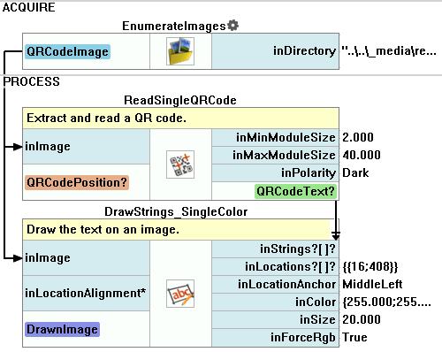 Add the ReadSingleQRCode filter to PROCESS section. Connect the outImage output of the EnumerateImages filter to the inImage input of the ReadSingleQRCode filter.