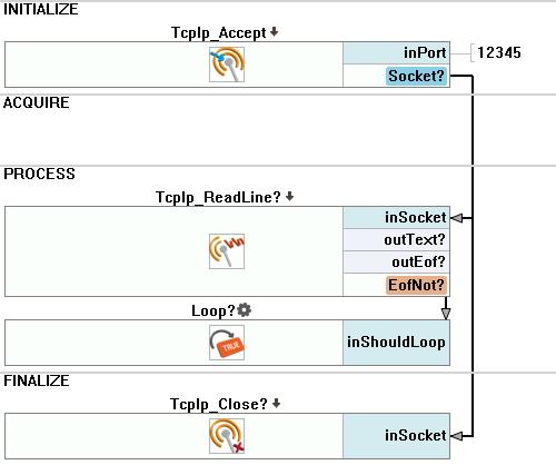 Turn on sections and add the TcpIp_Accept filter to the INITIALIZE section to accept the connection from the client. Rename the outSocket to Socket.