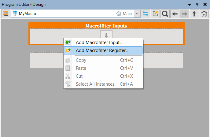 The context menus of macrofilter input and output blocks also contain a command for adding macrofilter registers, Add Macrofilter Register.... This is an advanced feature.