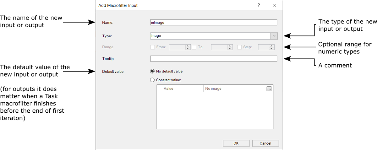 NOTE: Names of macrofilter inputs and outputs should be clear and meaningful. Names of inputs always start with "in", while names of outputs always start with "out".