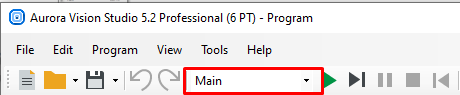 In Aurora Vision Studio a program can be any Worker Task macrofilter. The list of all macrofilters fulfilling this criterion can be seen in the StartUp Macrofilter combo box on the Application Toolbar. This control makes it possible to choose the program that will be run. The related macrofilter will be displayed in the Project Explorer with the bold font.