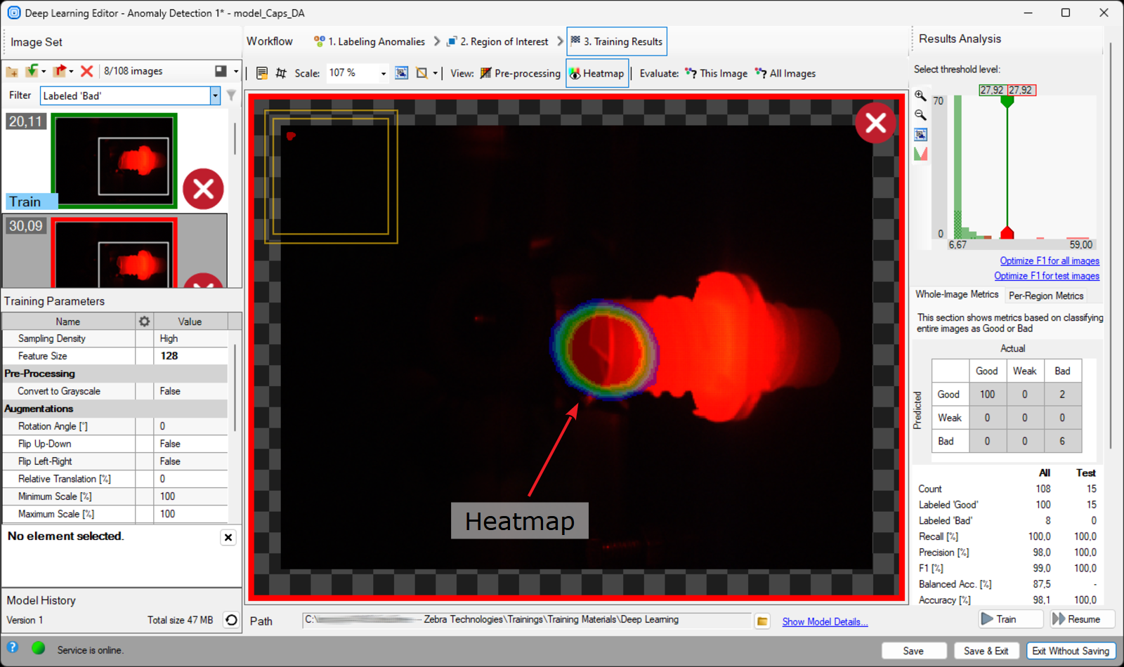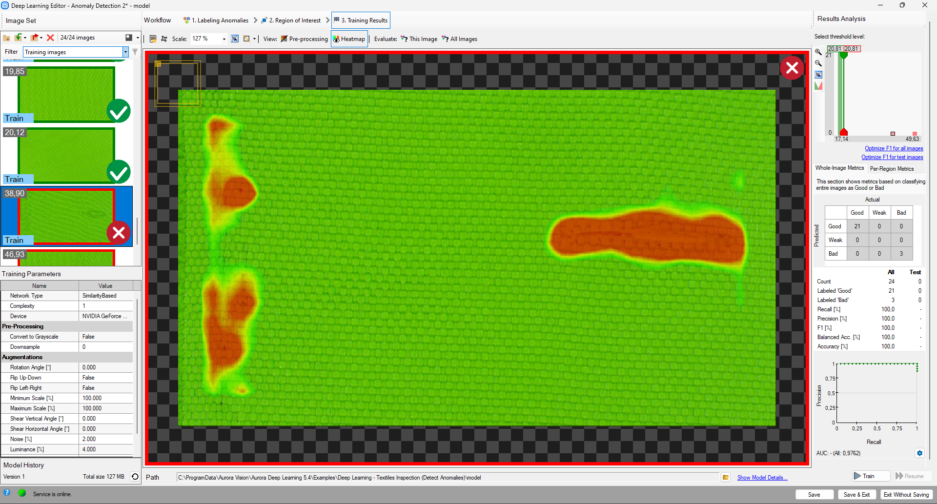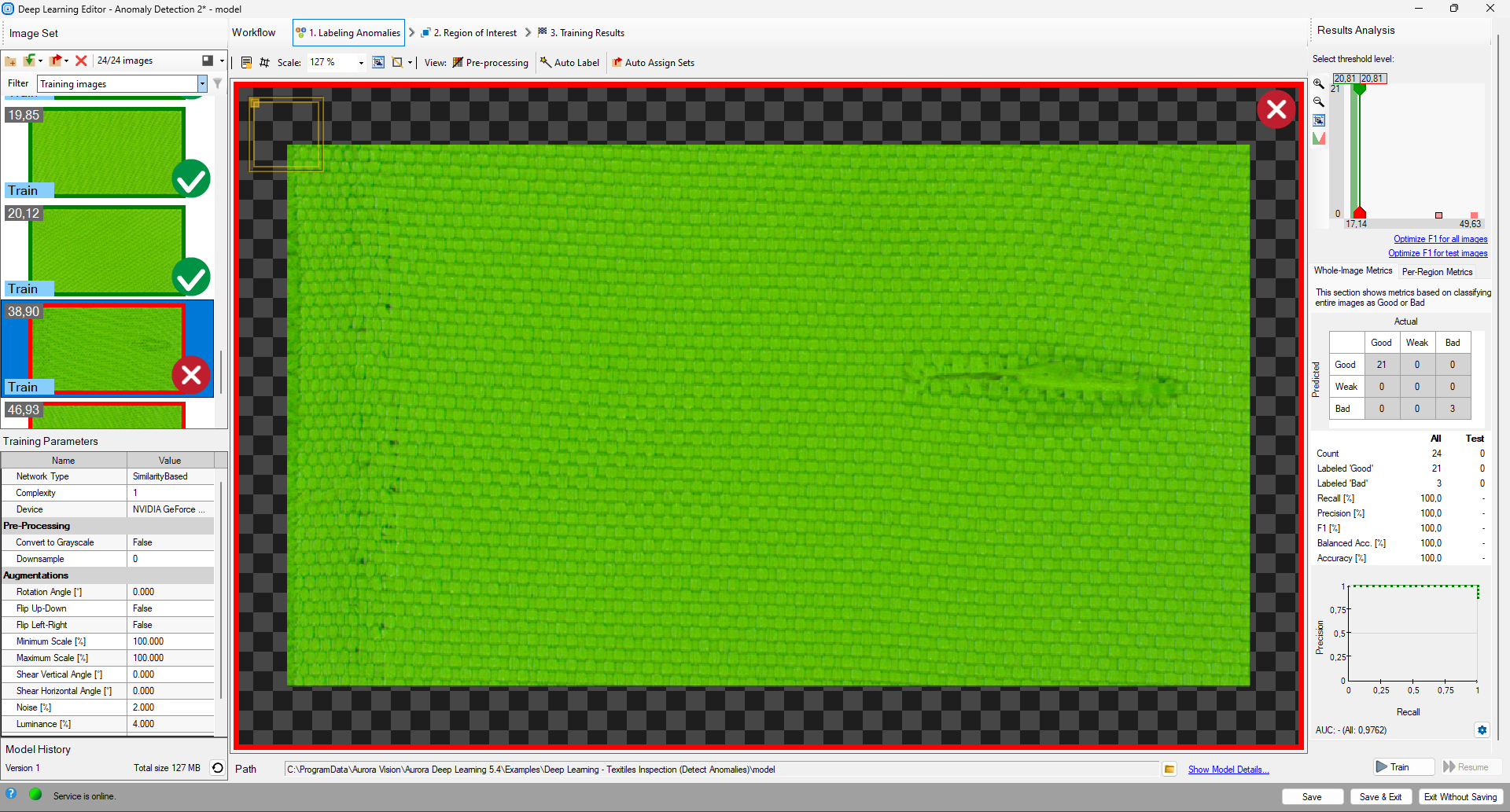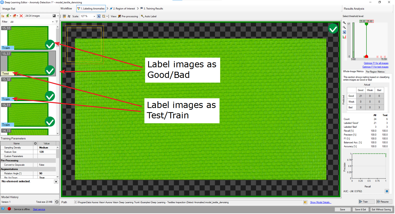 In this tool the user only needs to mark which images contain correct cases (good) or incorrect ones (bad). Training is performed on good images only. Inference can later be performed on both good and bad images to determine a suitable threshold.
