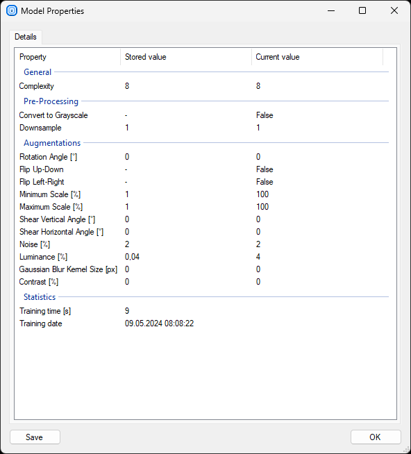 It is usually recommended to add some additional sample augmentations, especially when the training set is small. For example, the user can add additional variations in pixels intensity to prepare the model for varying lighting conditions on the production line. Refer to "Augmentation" section for detailed description of parameters: Deep Learning – Augmentation.