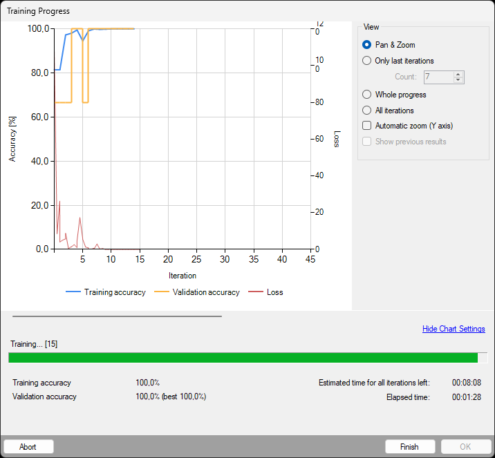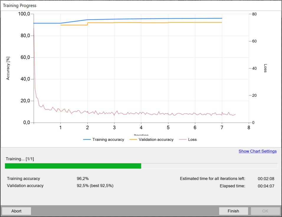 Training may be a long process. During this time, training can be stopped. If no model is present (first training attempt) model with best validation accuracy will be saved. Consecutive training attempts will prompt a user whether to replace the old model.