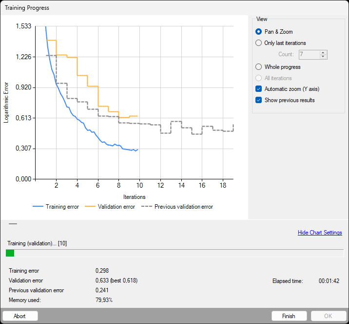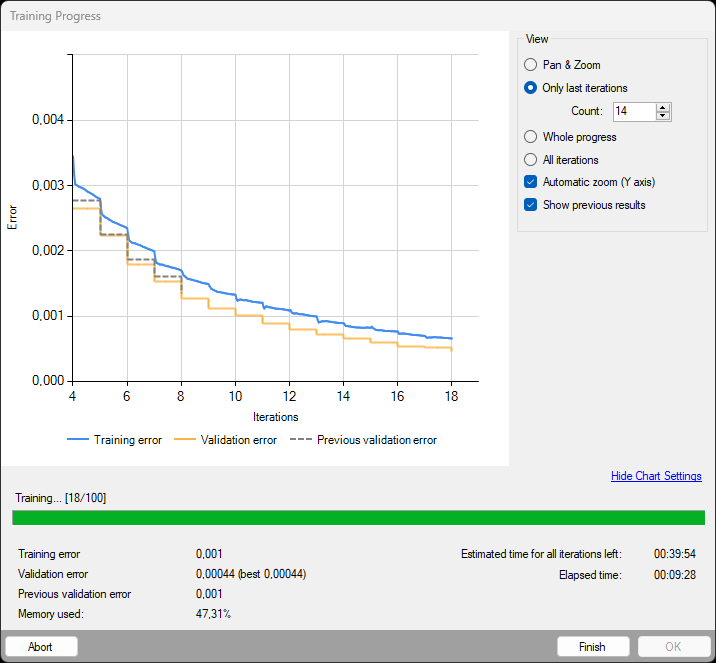 During training, two main series are visible: training error and validation error. Both charts should have a similar pattern. If a training was run before the third series with previous validation error is also displayed.