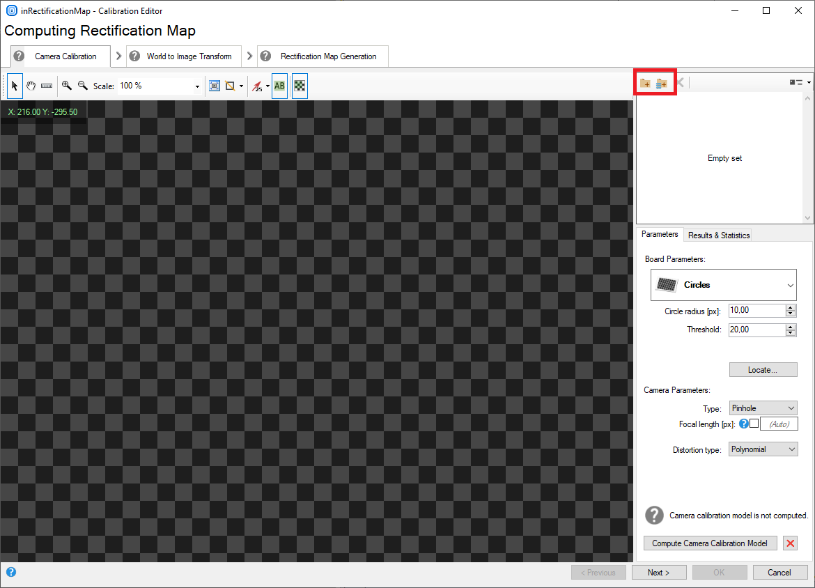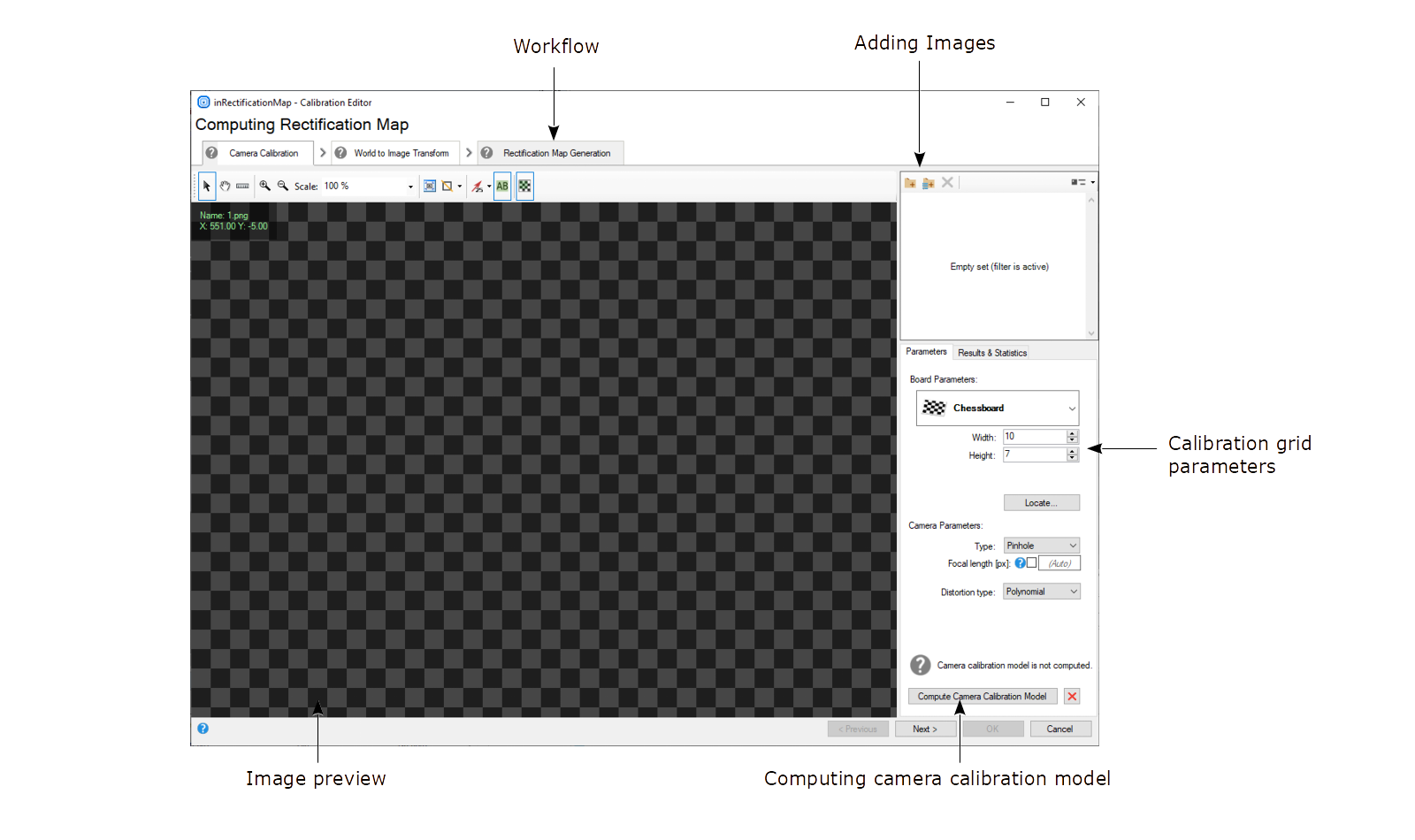 This guide will focus mainly on the first approach and show how to perform calibration with the editor step by step. To perform image rectification, the RectifyImage filter should be applied. When you click on the inRectificationMap input, the Calibration Editor will be displayed: