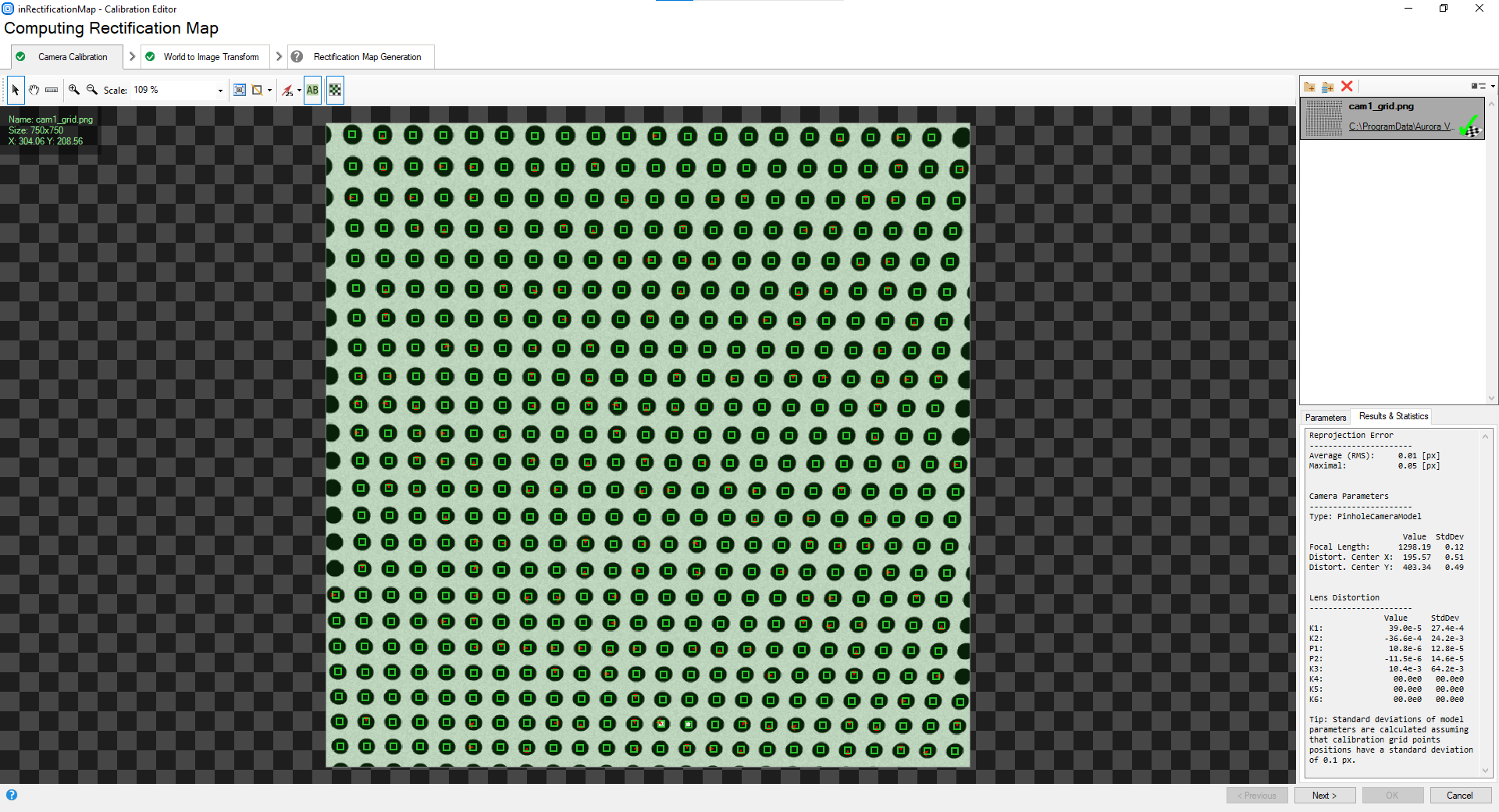 The Results & Statistics tab shows information about computed errors for both image and world coordinates. The output reprojection errors are useful tool for assessing the feasibility of computed solution. There are two errors in the plugin: Image (RMS) and World (RMS). The first one denotes how inaccurate the evaluation of perspective is. The latter reflects inaccuracy of labeling of grid 2D world coordinate system. They are independent, however they both influence quality of the solution, so their values should remain low.