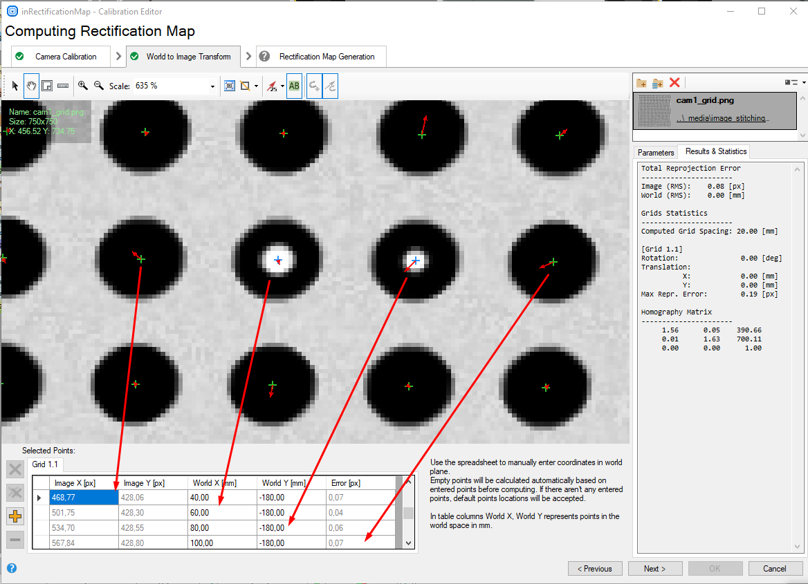 Arrows indicate which points from the calibration grid relate to corresponding rows in the spreadsheet. As you can see each row consists of coordinates in the image plane (given in pixels), coordinates in the world plane (given in mm), and error (in pixels), which means how much a point is deviated from its model location. In this case reprojection vectors, which are marked as small, red arrows, also indicate the deviation from the model.