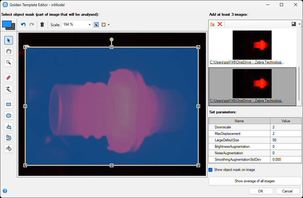 To create a golden template model you need at least three same-sized images representing the same object. The object should be placed in the same way in all the images. Otherwise, the final model may not be accurate enough.