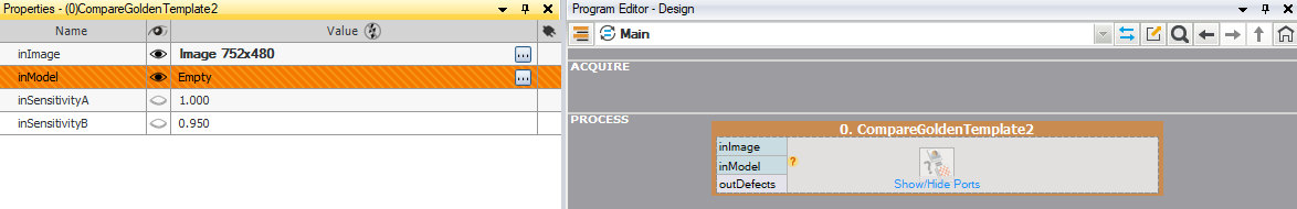Golden Template is an image comparison technique. It is based on the pixel-to-pixel comparison but uses multiple images and advanced algorithms to create a multi-image model. It is useful for finding general defects of objects that have fixed shape. In order to simplify the process of model creation a "GUI for Golden Template 2" was created. It is possible to access it by clicking on the button at the inModel input in the Properties window: