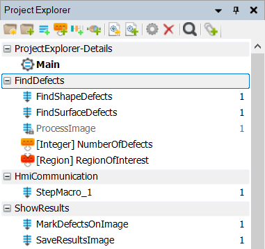 The image below shows a structure of an example program. The macrofilters have been grouped into two Modules. Module FindDefects has macrofilters related to defect detection and a global parameter used by the macrofilters. Notice how the ProcessImage macrofilter is grayed out. It indicates it is a private macrofilter (here it is used by FindShapeDefects). ProcessImage cannot be used outside its module.