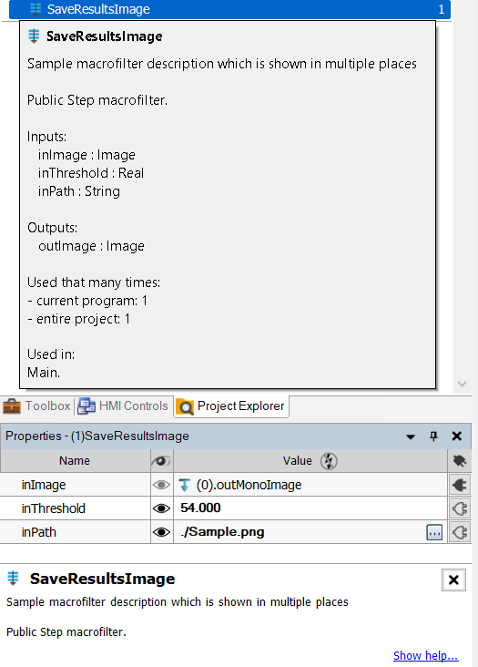 As described in Running and Analysing Programs, there are two ways of navigating through the existing macrofilters. One of them is with the Project Explorer window, which displays definitions of macrofilters, not the instances. After double-clicking on a macrofilter in the Project Explorer, however, a macrofilter instance is opened in the Program Editor. As one macrofilter definition can have zero, one or many instances. Some special rules apply to which of the instances it is: