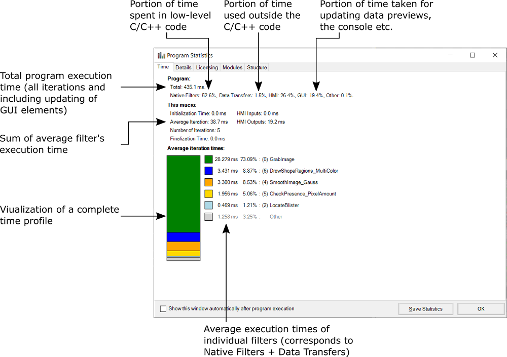 The Program Statistics window contains information about the time profile of the selected macrofilter. This is very important as real vision algorithms need to be very fast. However, before starting program optimization we must know what needs to be optimized, so that later we optimize the right thing. Here is how the required information is presented: