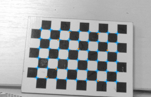 Good case of image to world plane calibration using high amount of calibration points. Calibration resulted in RMS and maximum reprojection errors less than 1.0, as expected. The outReprojectionErrorSegments are not visible at that scale.