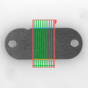 The filter measures the width of an object present in an image. Internally, it performs a series of scans with ScanSingleStripe filter along inScanCount parallel scan segments constructed from inScanField. The so obtained points are then used for computing two parallel segments by means of a slightly modified segment fitting routine. The process is supported by inOutlierSuppression parameter. Finally, having the aforementioned stripe widths and fitted segments' direction, the object width can be computed using a selected inMeasureMethod method. The inOutlierCount stripe widths most differing from the median width are not used in this step. For the filter to work properly, the scan segments do not have to be necessarily perpendicular to the object edges.