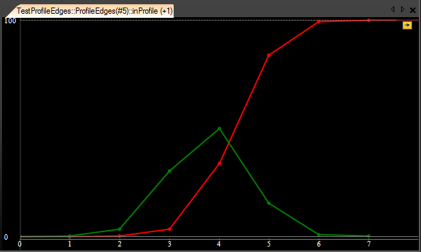 Sample edge profile (red) and its derivative (green). Please note, that the derivative is shifted by 0.5.