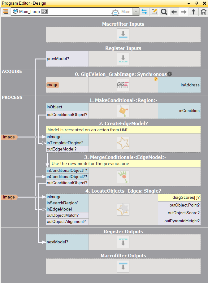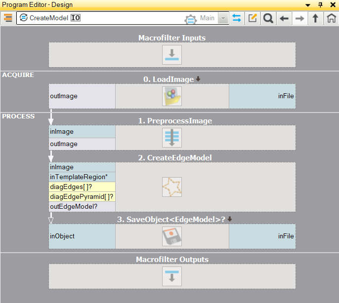 Please note that the use of CreateGrayModel and CreateEdgeModel2 filters will only be necessary in more advanced applications. Otherwise it is enough to use a single filter of the Matching step and create the model by setting the inGrayModel or inEdgeModel parameter of the filter. The CreateEdgeModel2 and LocateMultipleObjects_Edges2 filters are preferred over CreateEdgeModel1 and LocateMultipleObjects_Edges1 because they are newer, more advanced versions with more capabilities.