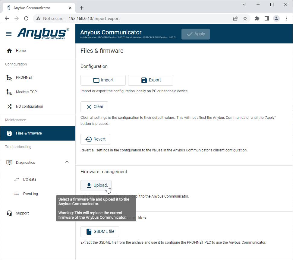 Click Upload and navigate to download firmware directory. It consists of GSDML file for later (hardware definition for Profinet PLC) and firmware file: