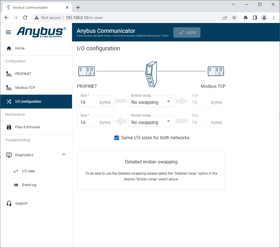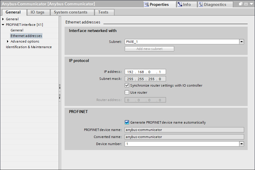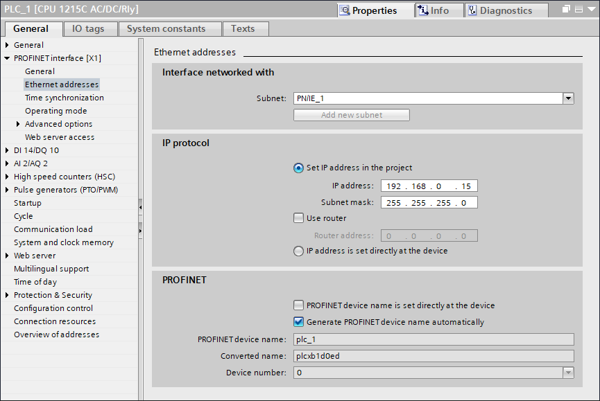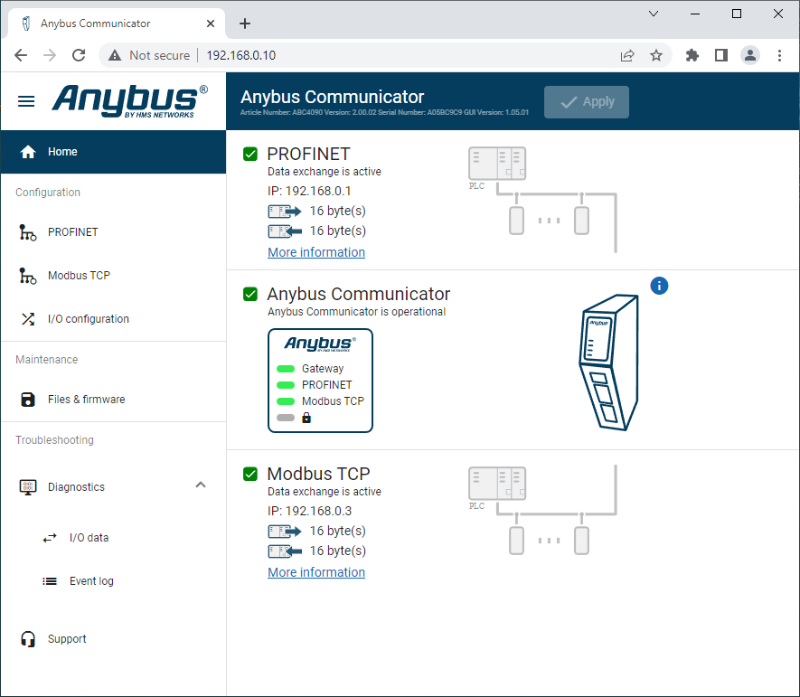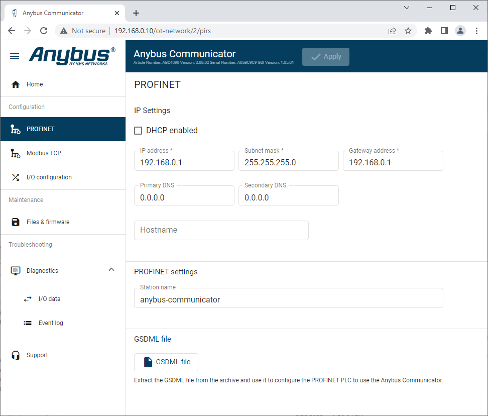 Devices linked should have an IP address which belongs to 192.168.0.0 network. Go to Configuration -> PROFINET tab, change settings like on the screen attached below and click Apply: