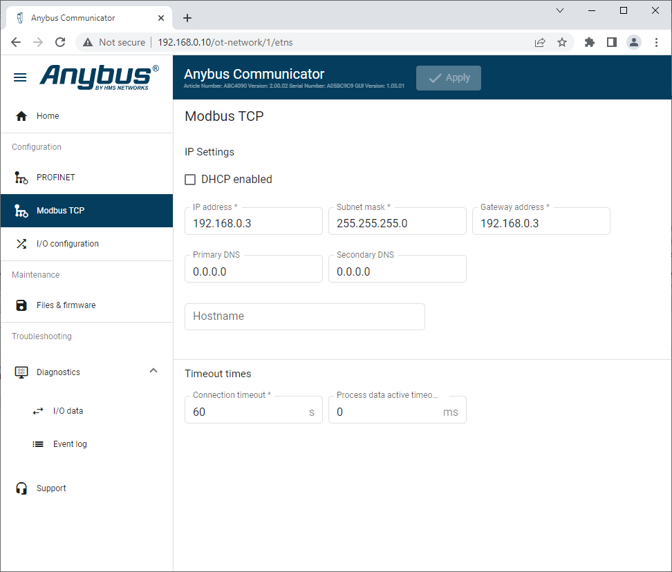 Devices linked should have an IP address which belongs to 192.168.0.0 network. Go to Configuration -> Modbus TCP tab, change settings like on the screen attached below and click Apply: