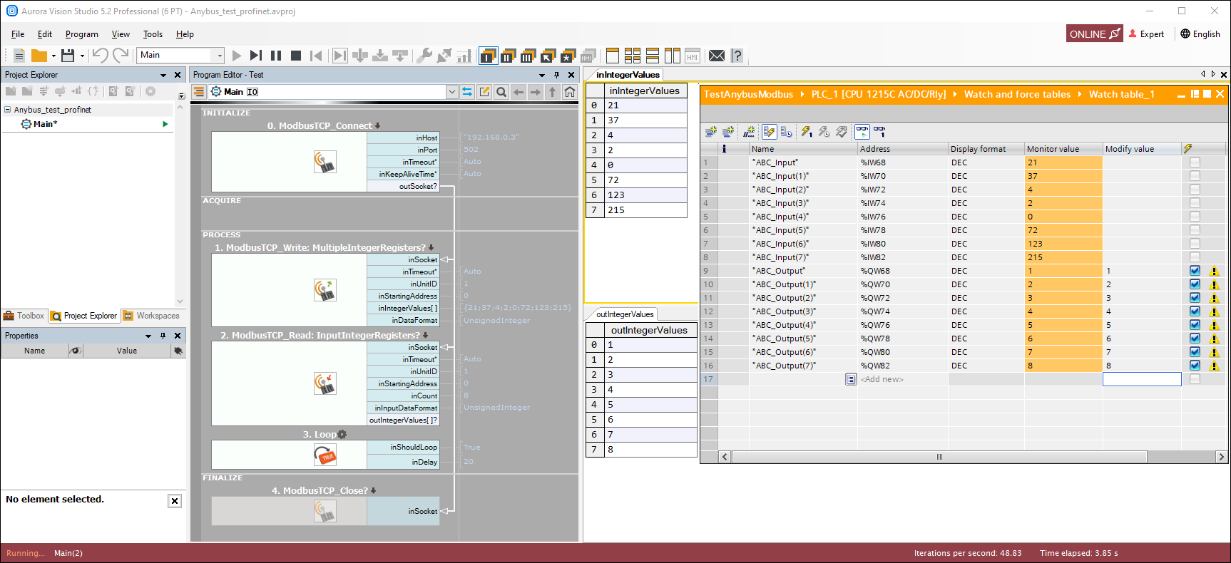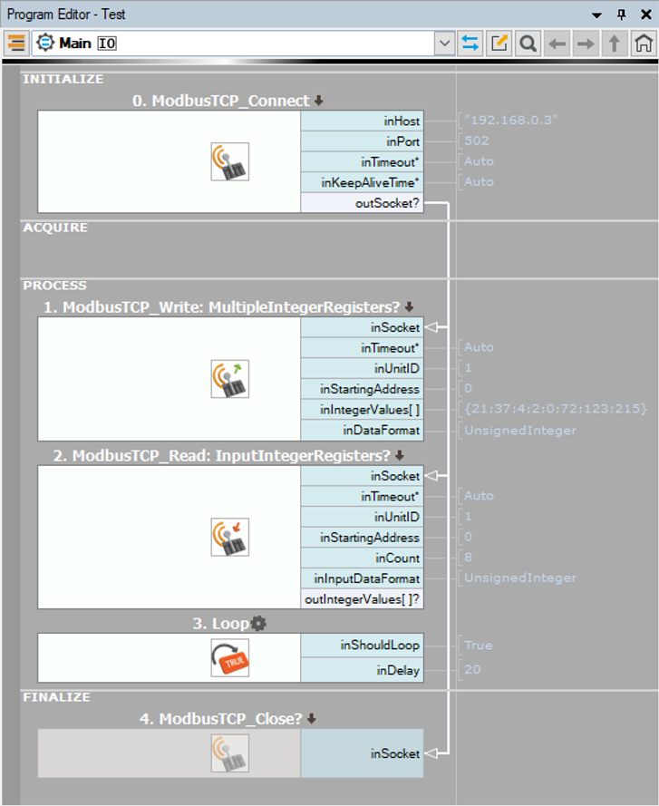 Aurora Vision Studio application should have ModbusTCP_Connect and I/O Read/Write filters as on the screen attached below: