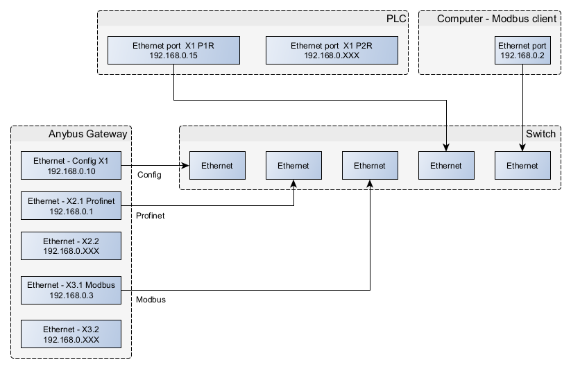 In application notes there is configured one network which uses Ethernet switch. Devices connected to this network have addresses 192.168.0.XXX, where XXX stands for number 1-254 unique for every device/port connected.