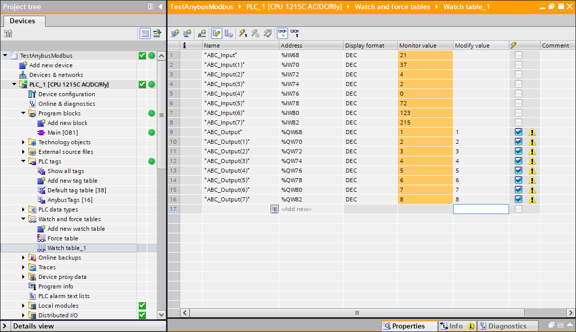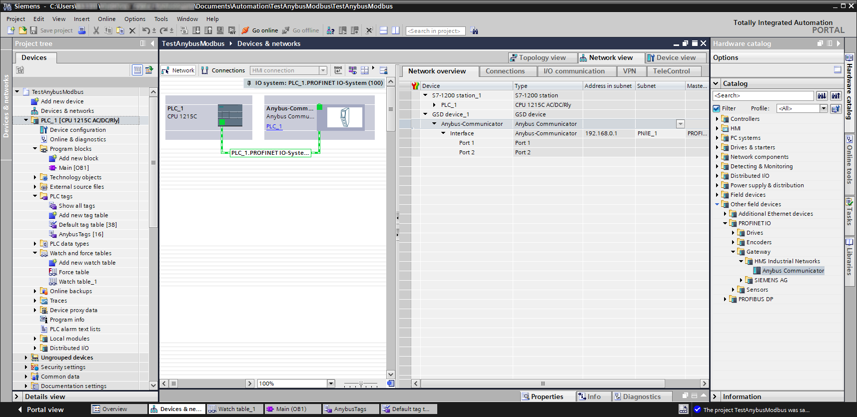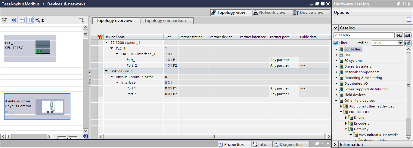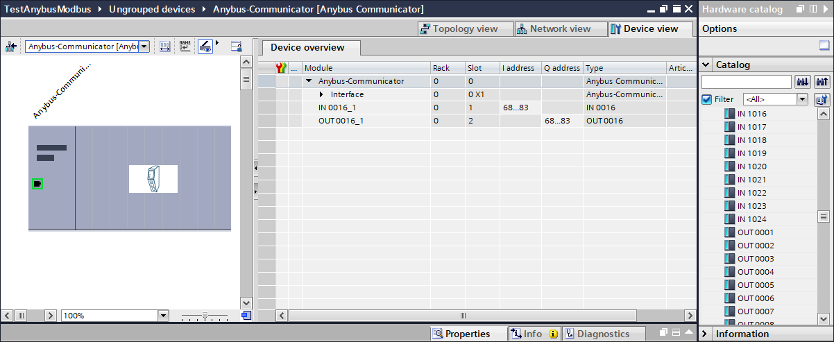Add two modules to the project which match these configured in Anybus web configurator. Drag & drop IN 0016 and OUT 0016 module onto Device overview: