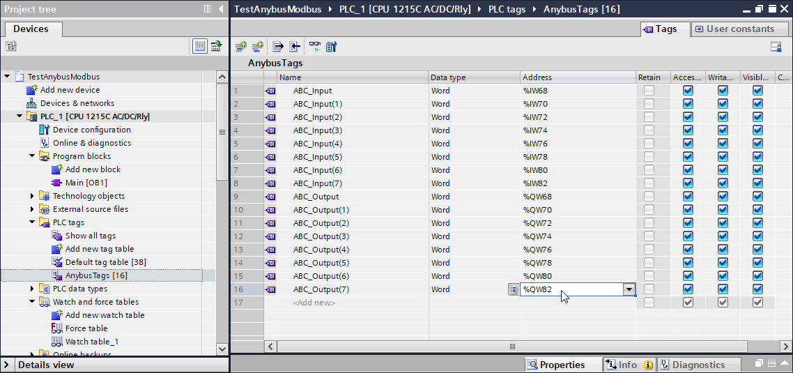 It is good manner to use gateways In/Outs by PLC tags - using raw addresses you can mistakenly modify/read wrong bytes. Create "AnybusTags" table in PLC tags folder: