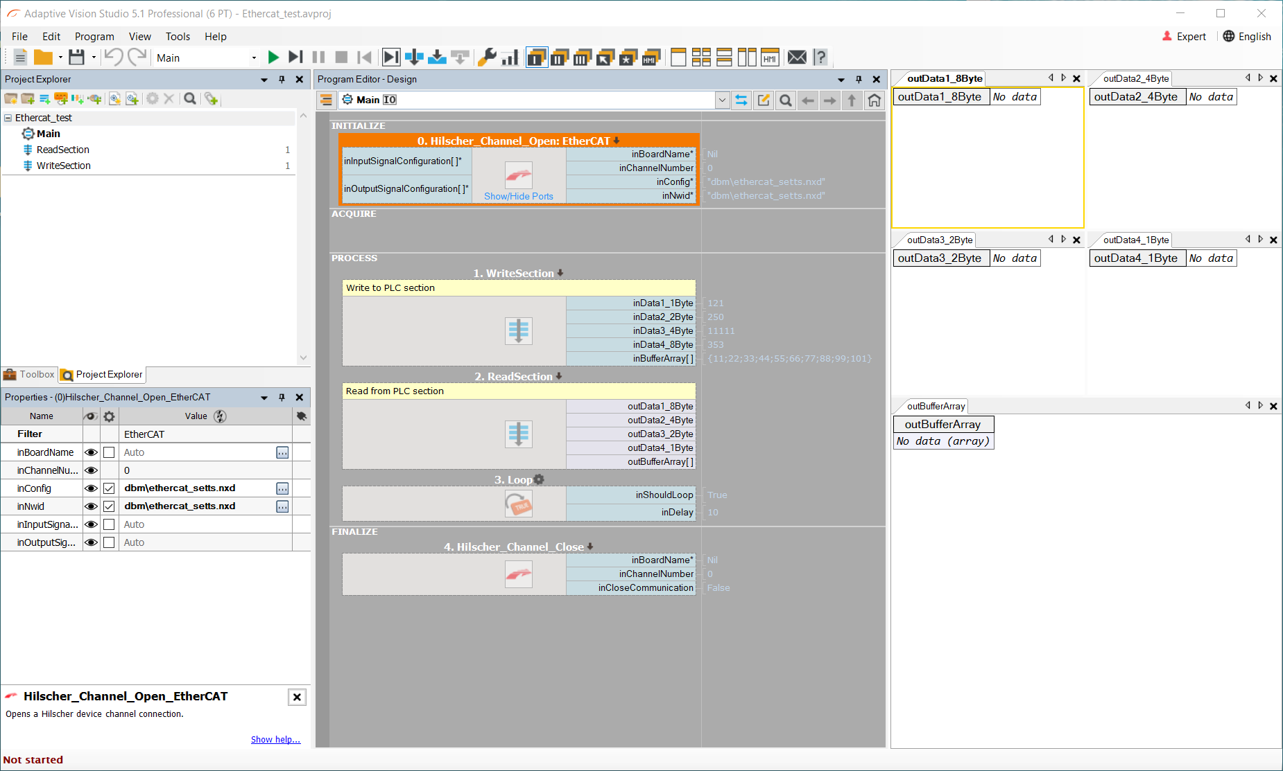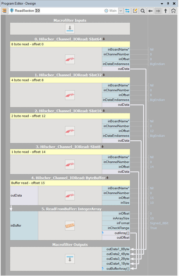 In step macrofilter ReadSection you can find for example Hilscher_Channel_IORead_SInt8 filter which writes 8 bytes of signed data to the predefined memory area. Using different offsets for each macrofilter enables access to different variables created in PLC (Example configuration of EtherCAT PLC section of this tutorial).