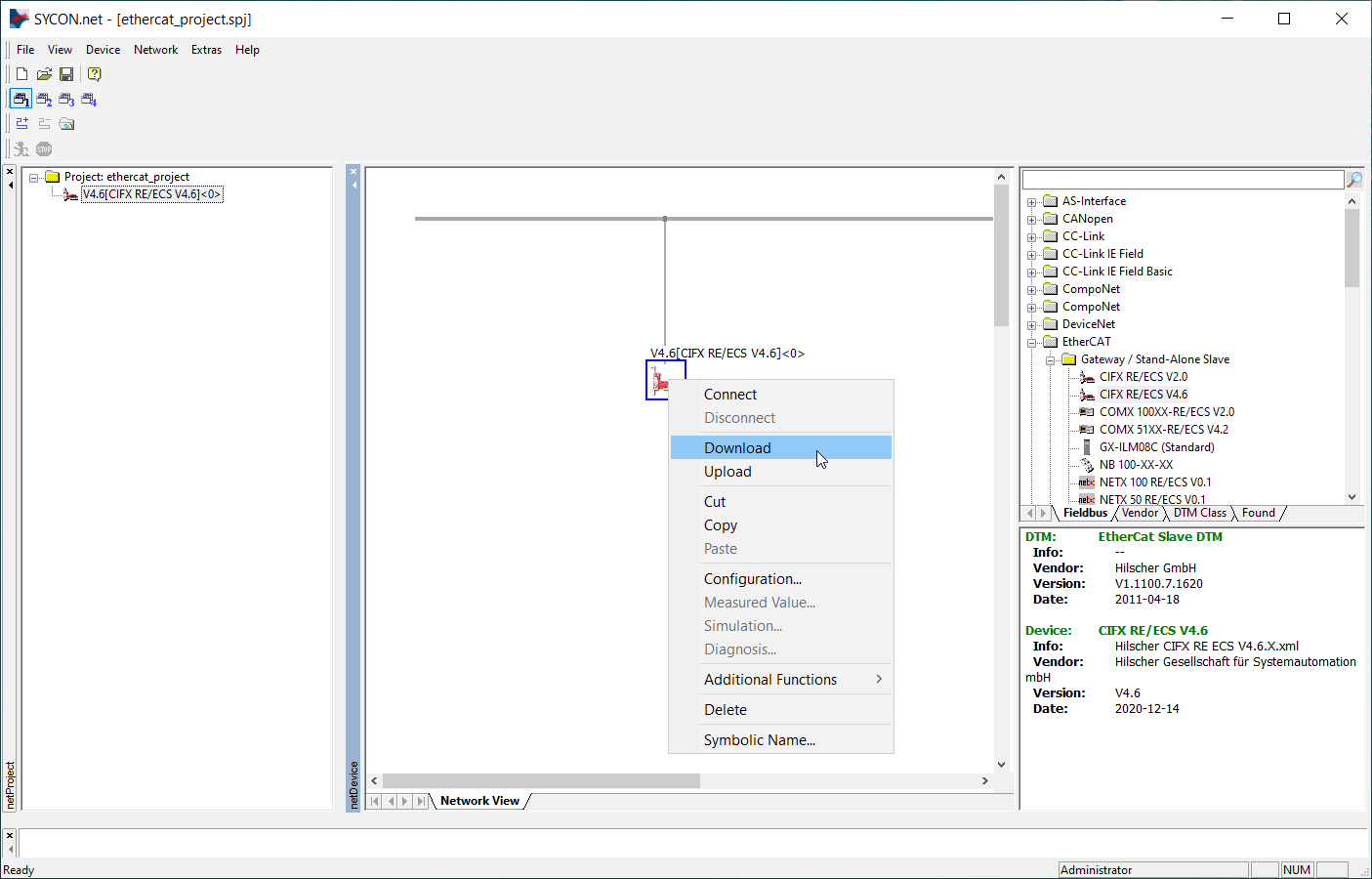 Configuration files are generated in SYCON.net software. Firstly, pick a proper device and drag it to the gray bus on the "Network View". This device you can find navigating to "EtherCAT -> Gateway / Stand - Alone Slave -> CIFX RE/ECS V4.6".