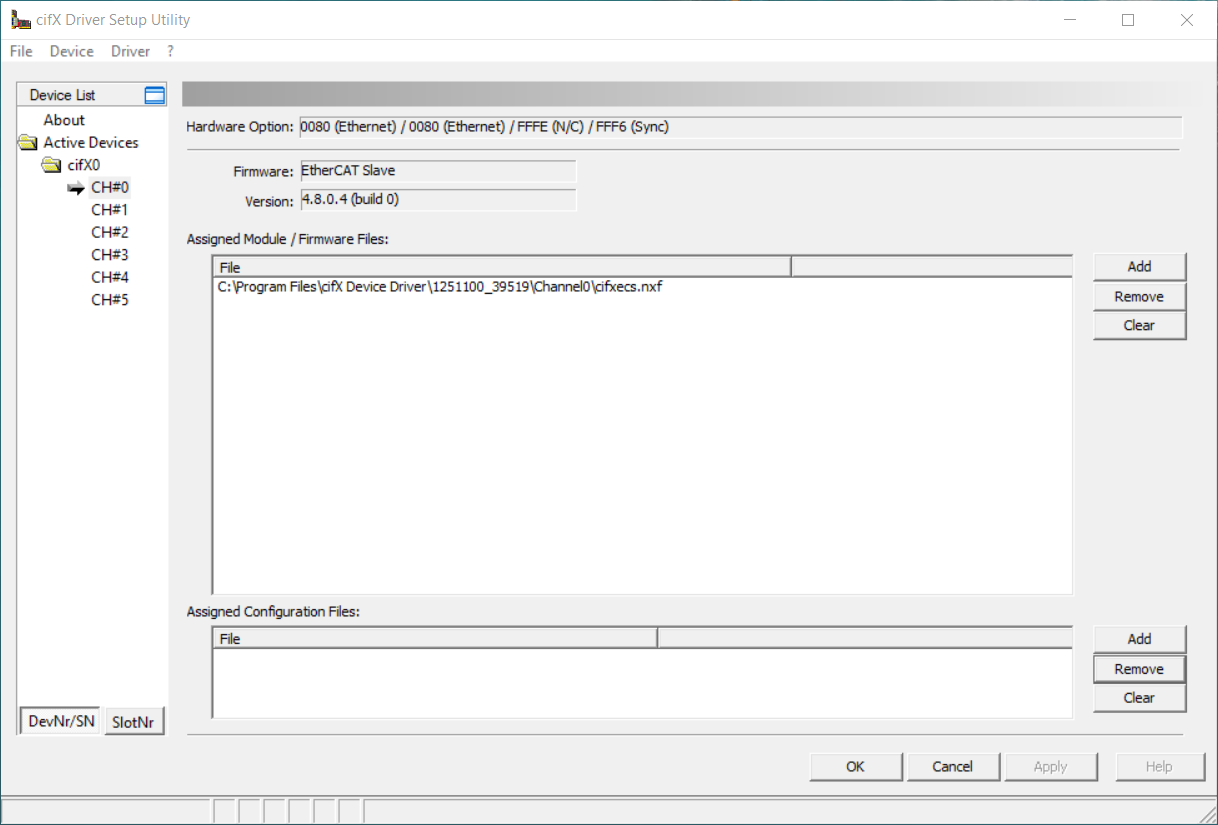 Using cifX Setup application select the channel you would like to configure (usually channel - CH#0) and remove preexisting firmware by clicking "Clear". Then click "Add" to add a new firmware file and navigate to the downloaded EtherCAT Slave firmware (path \COMSOL-ECS V4.8.0.4\Firmware\cifX). Then click "Apply" and finish configuration with "OK".