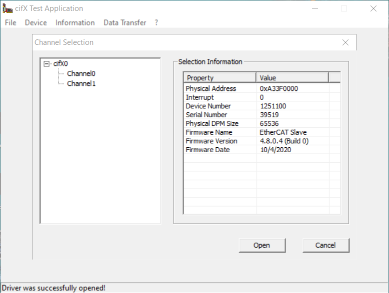 To be sure that firmware is installed properly you can open cifX Test software and then navigate to Device -> Open to achieve the result like below.