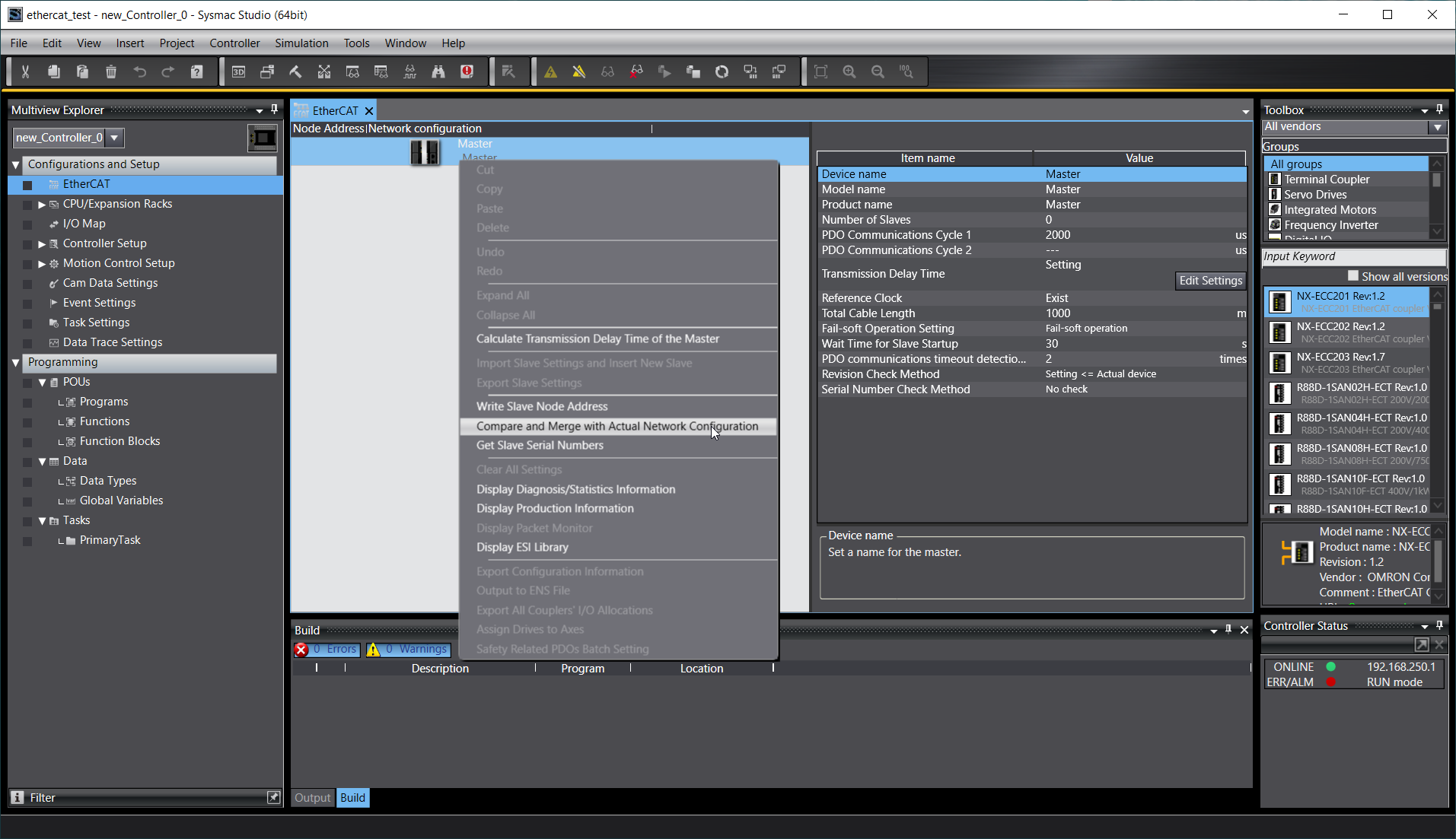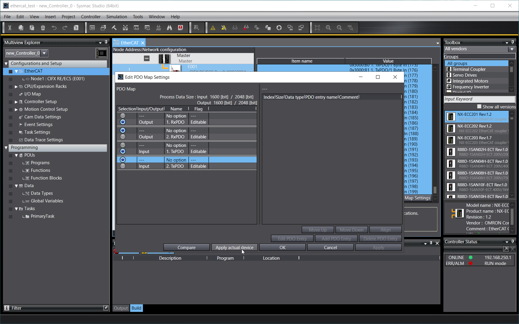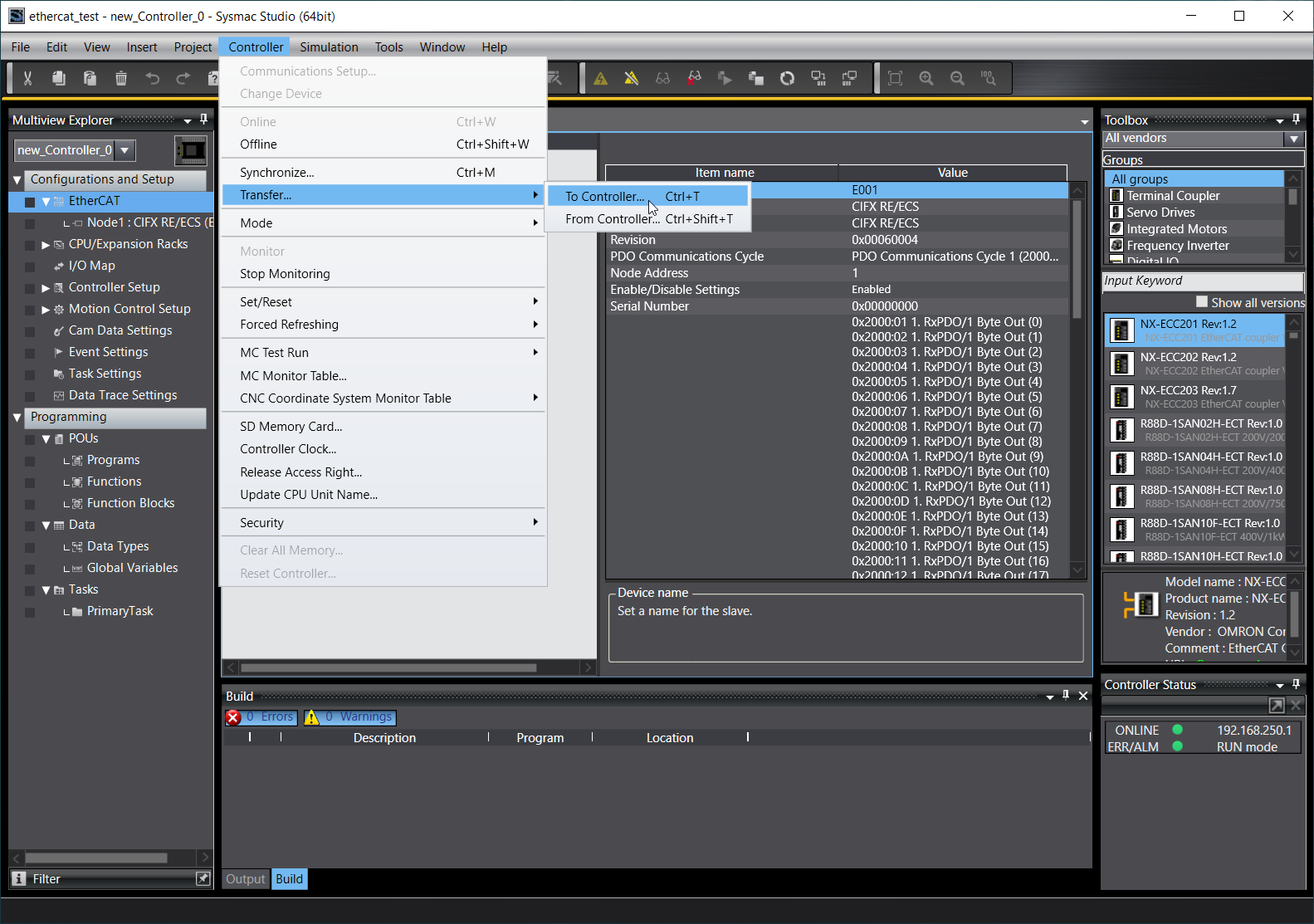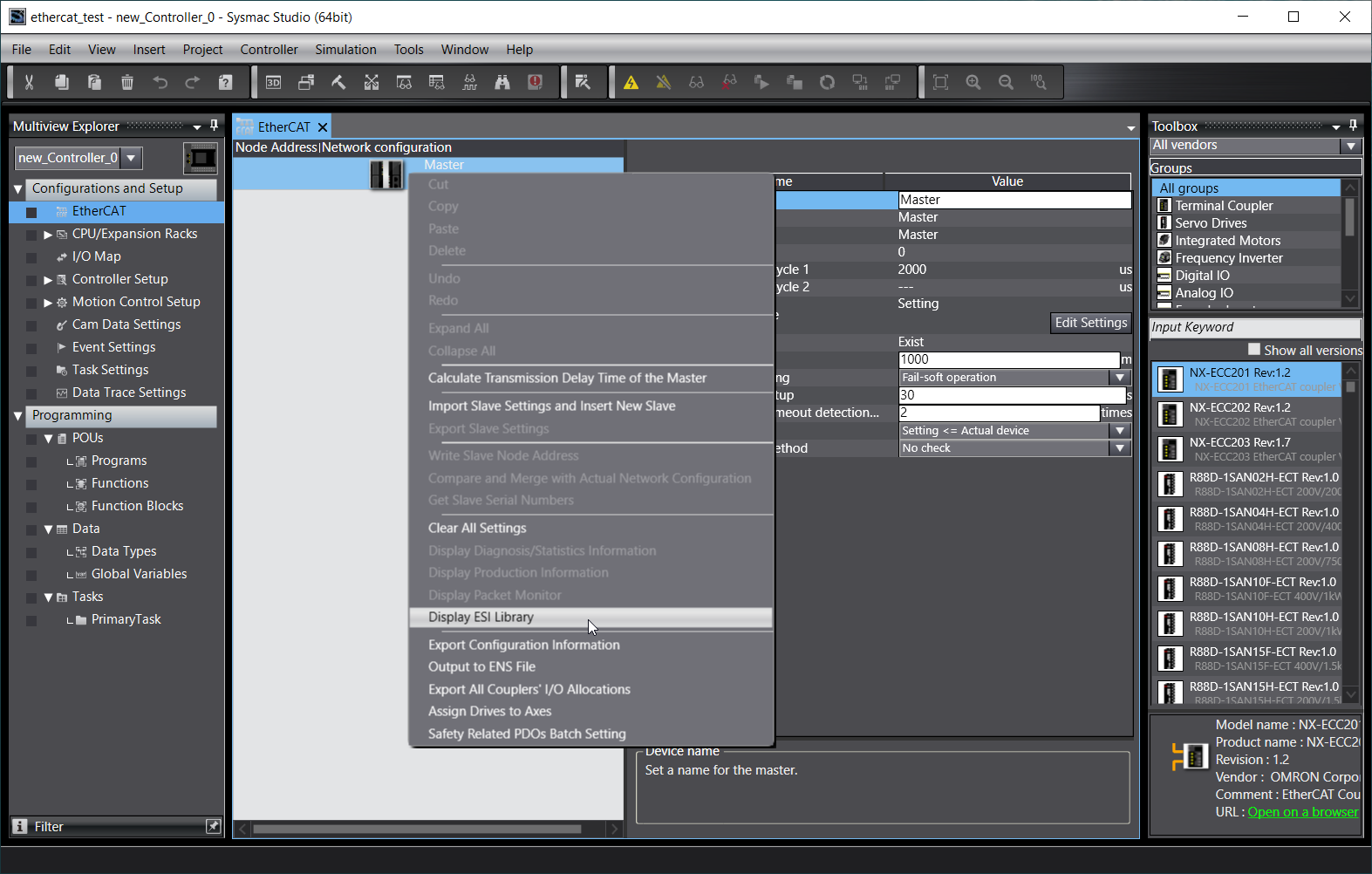 Below you will find an example configuration process for EtherCAT PLC Omron NXJP2-9024DT in Sysmac Studio software.