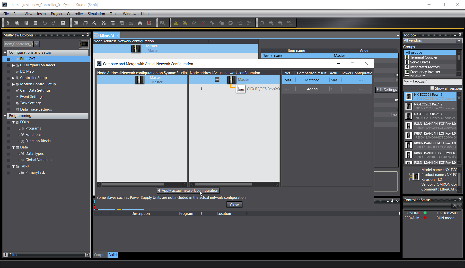 If everything is connected correctly Compare and Merge with Actual Network Configuration window should pop-up. To match configuration in software to configuration in hardware click "Apply actual network configuration".