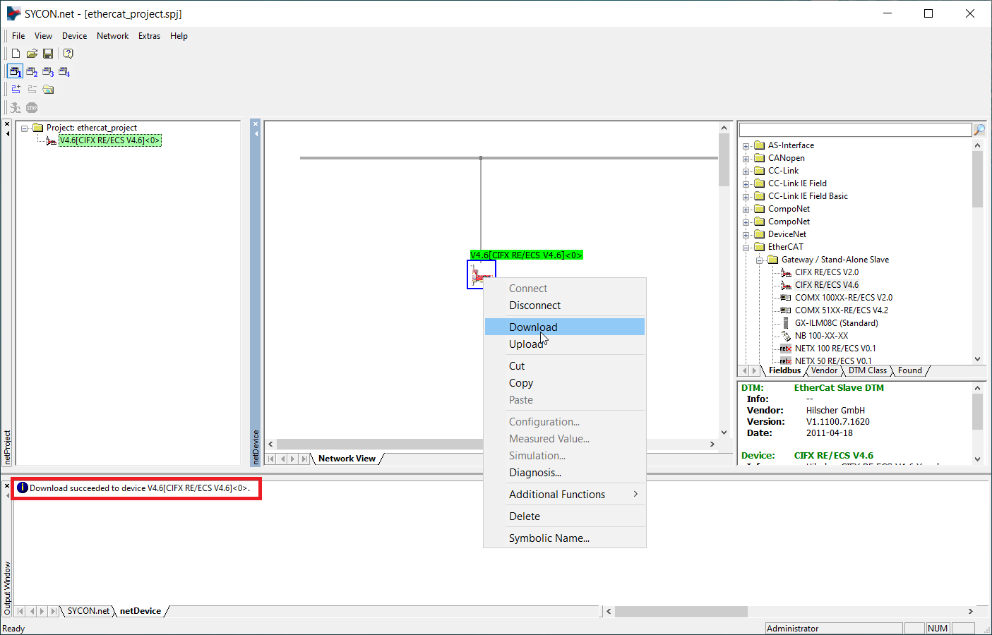 1. Make sure that the current program setting is loaded to the Hilscher card. If not please use SYCON.net application to connect and download settings to the devices as shown in the picture below.