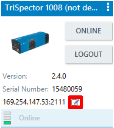 It is necessary to detect the camera in Aurora Vision Studio later on and configure all of the parameters used by it (SICK does not allow to modify majority of the parameters by third party software). The next step is to install the correct drivers as they are required for the device to work correctly. In the window seen below you can adjust the IP address of the camera (red box) or enter the editor (double click).
