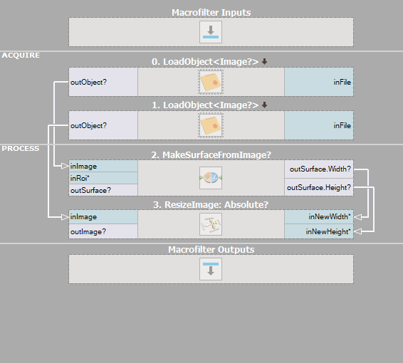 A simple program that stops when the full image form the camera is acquired is presented on the first image below. The second image is the program that loads the acquired objects, resizes them properly and allows further analysis of the image.