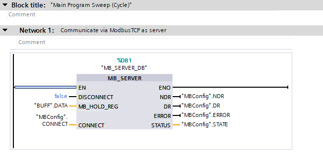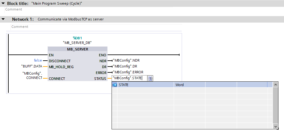 Attach the data block variables to the inputs and outputs of the MB_SERVER block in the way presented below: