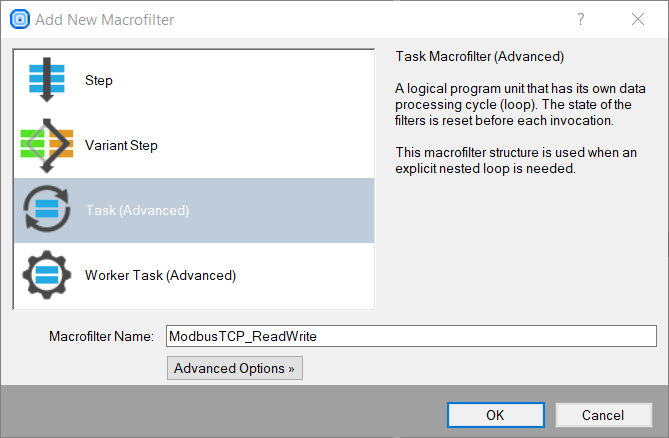 Open the newly created Task Macrofilter and add the ModbusTCP_ReadDiscreteInputs, ModbusTCP_ReadMultipleIntegerRegisters, ModbusTCP_ForceMultipleCoils and ModbusTCP_WriteMultipleIntegerRegisters filters in the arrangement simulating that in the image below: