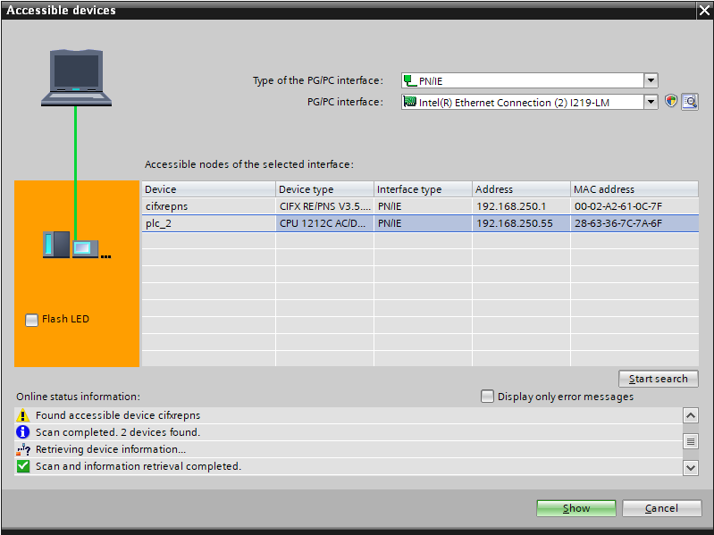 Select the Accessible devices icon from the toolbar to open the configuration window. Select the PN/IE type of the PG/PC interface and then the Ethernet card connected to the PLC. Click the Start search button, choose your PLC from the list of accessible nodes and click the Show button.