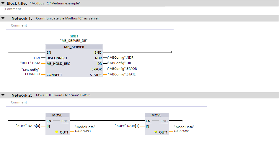 Nothing has changed for Network 1 of the Advanced program; MB_SERVER block is used to establish the Modbus TCP connection. For Network 2 use MOVE blocks to move appropriate BUFF data words to the ModelData.Gain variable.