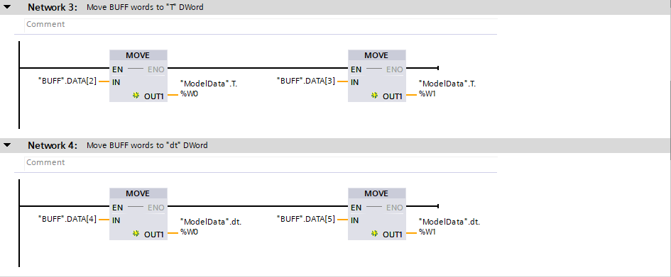 For Networks 3 and 4, use MOVE blocks to move BUFF words to ModelData.T and ModelData.dt.