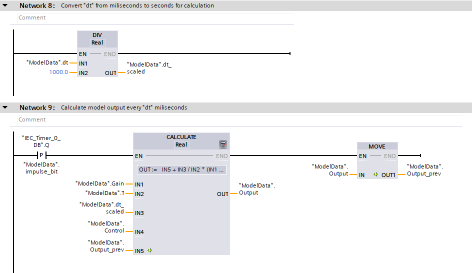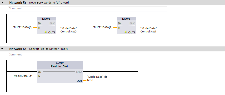 For Network 5, use MOVE blocks to move BUFF words to ModelData.Control. For Network 6, use a CONV block to convert Real values to Dint values for further use in timers blocks.