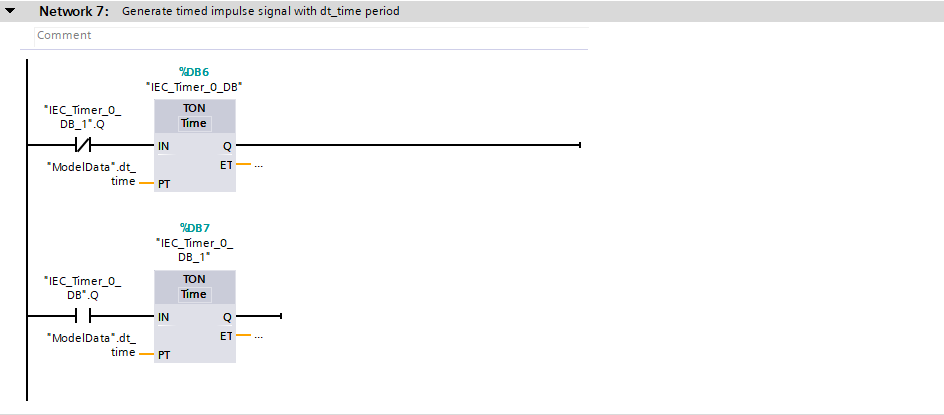 Network 7 uses TON Timer blocks to generate a timed impulse signal for further calculations. Create a new branch in this network, put TON blocks in the network and create Data blocks appropriate for them.