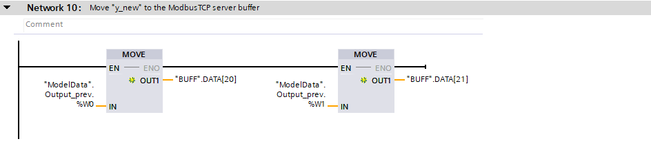 For Network 10, use MOVE blocks to move ModelData.Output_prev words to BUFF. This variable will be read in Aurora Vision Studio application.